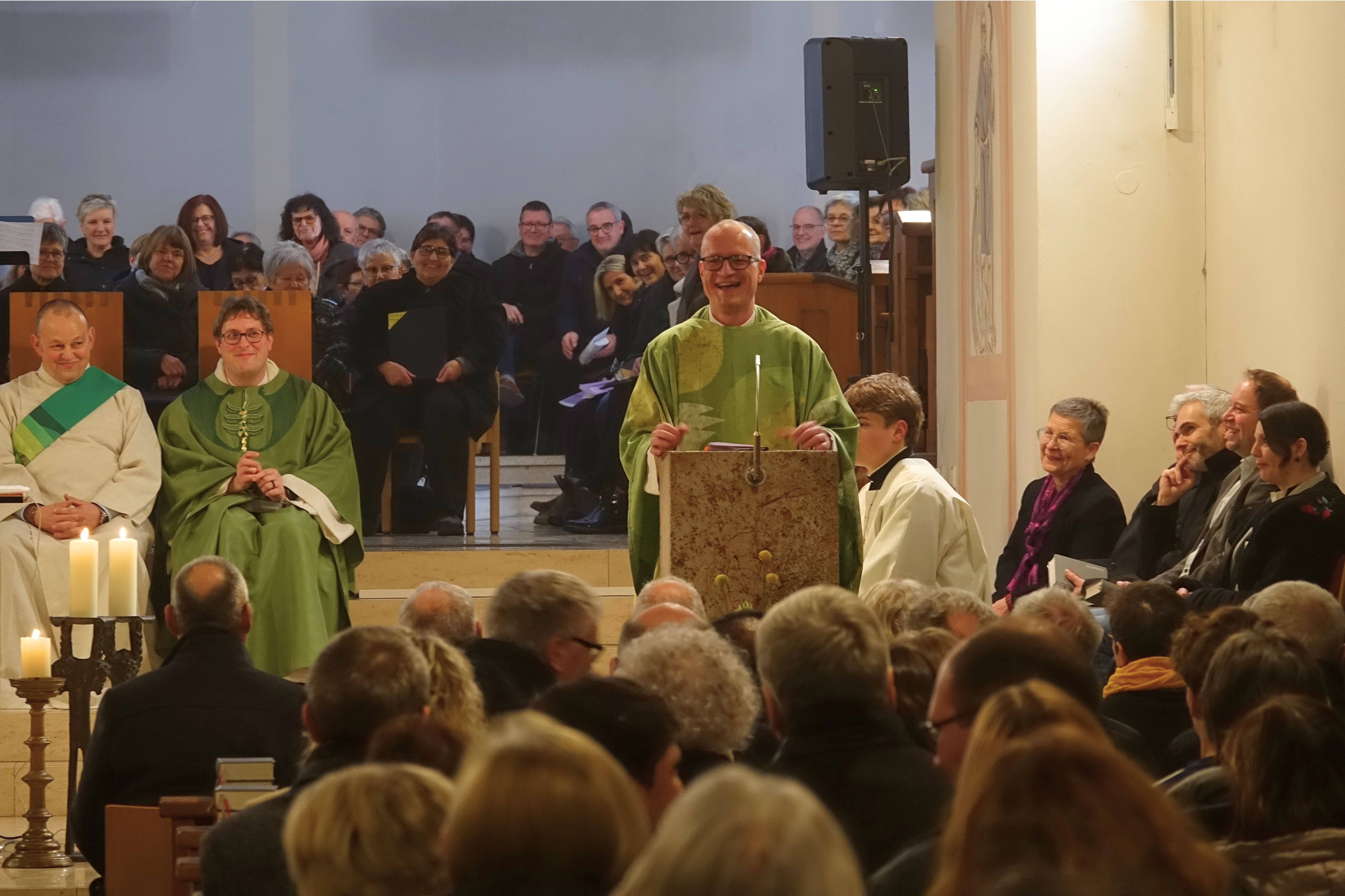 Den Auftakt der Feier bildeten die begrüßenden Worte des Vorsitzenden des neuen Pfarreirats, Rolf Eichelmann. Daran anschließend folgte das Verlesen der Investitururkunde von Erzbischof Stephan Burger, die Neubrand der Gemeinde verlas. Neubrand rief zur Zusammenarbeit und Mitverantwortung aller Haupt- und Ehrenamtlichen in der Pfarrei Neu auf.